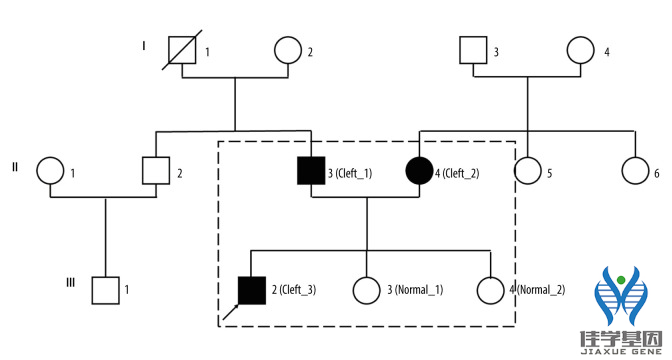 EVO视讯官网基因检测从每位参与的家庭成员处取得了临床信息和外周血样本。五名成员参与了研究(见图1,黑色虚线矩形)。其中三名成员有完全唇裂合并腭裂,另外两名为正常对照(正常1和正常2)。父母分别为II3(Cleft 1)和II4(Cleft 2),两人均有单侧完全唇裂合并腭裂,而III2(Cleft 3)为有双侧完全唇裂合并腭裂的儿子。